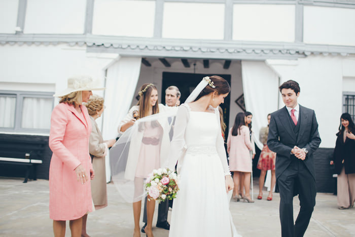Simplemente me encanta, veo una boda actual, bonita y elegante, el vestido me parece ideal, muy fino y no entiendo mucho de vestidos de novia, las mangas las veo bien y los botones por fuera son para mi entender un detalle, vamos que me encanta todo, entiendo que es una boda de otoño por el vestuario de casi todos los invitados, madrina y las niñas que me parecen monisimas.