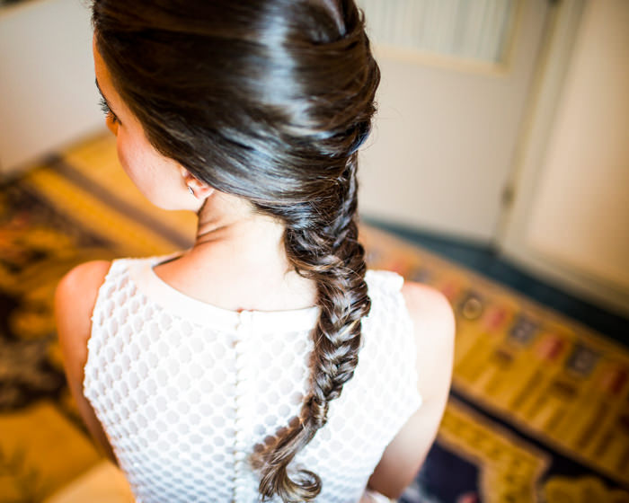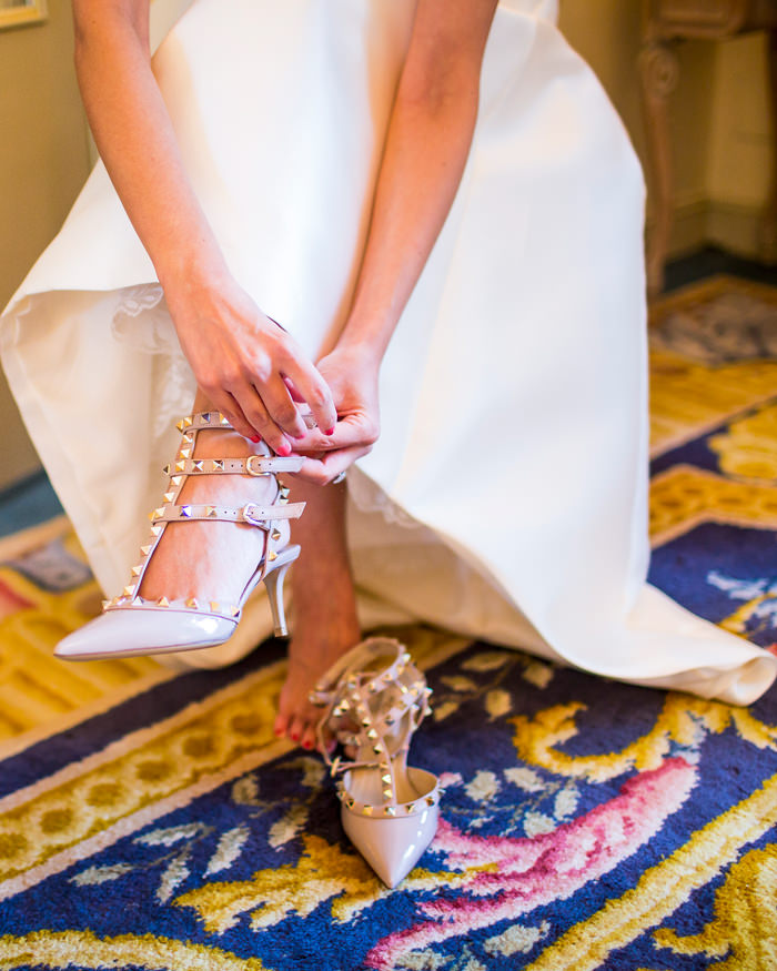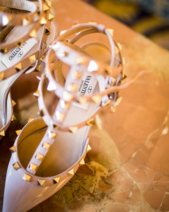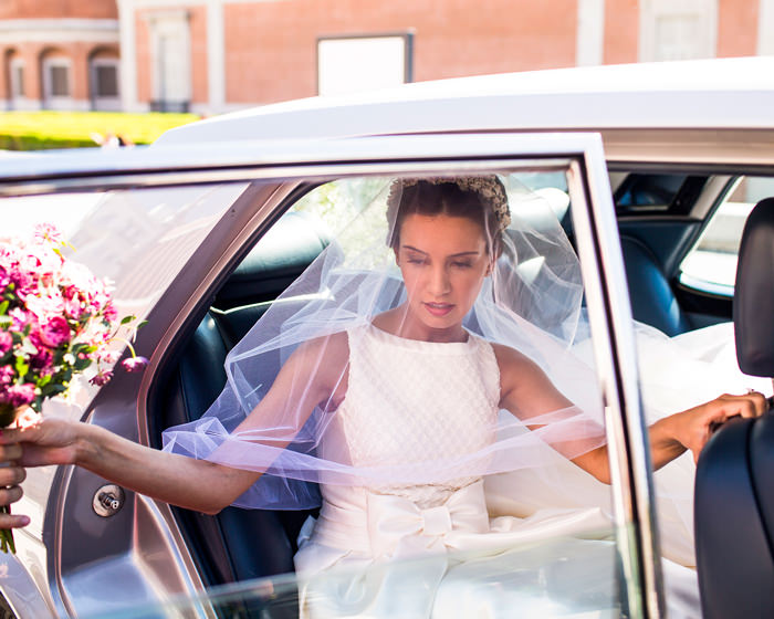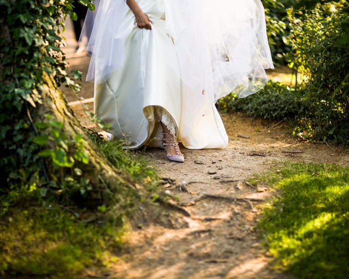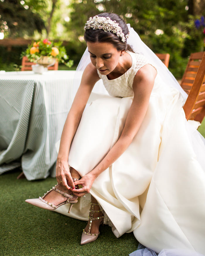 El vestido de María era de Rosa Clará. Se trata de un modelo personalizado y a medida. Tenía tan claro su estilo que fue realmente sencillo diseñarlo. Se trataba de un modelo desmontable, así para la ceremonia llevaba una sobrefalda que luego para la celebración se pudo quitar y estar mas cómoda. La espalda era de tul bordada con pequeños cristales y cuentas. Los zapatos eran el modelo rockstud de Valentino con tacón medio en color nude. Su ramo de novia era de Bourguignon, compuesto por rosa splash sensation, astrantia, trachelium, dianthus, hojas de gala y eucalipto.
