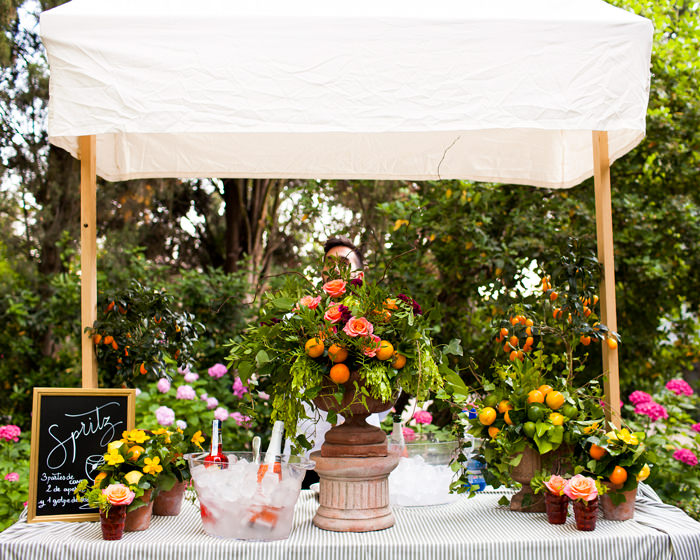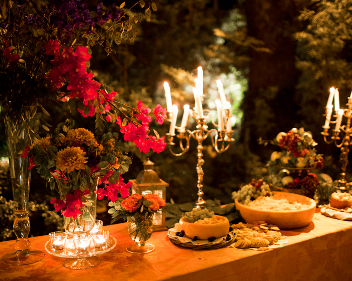 La celebración fue en La Finca las Jarillas. Una de las razones más importantes de elegir este emplezamiento era por el catering que sirven allí en exclusiva, La Cococha de Rocío Gandarias. Ya les conocían de antes y sabían que era una apuesta segura. La decoración estaba diseñada al milímetro, todo giraban en torno a Venecia, ciudad donde empezó todo. Por lo que intentaron recrear un jardín veneciano con sus tonalidades naranjas, fucsias y rojas. Querían grandes centros llenos de flor y hiedra, así como enormes candelabros que daban un aire renacentista. Fuera en el jardín pusieron un corner de Spritz — típica bebida veneciana. Tanto el interior de la finca como el jardín estaba decorado por Inés Urquijo.